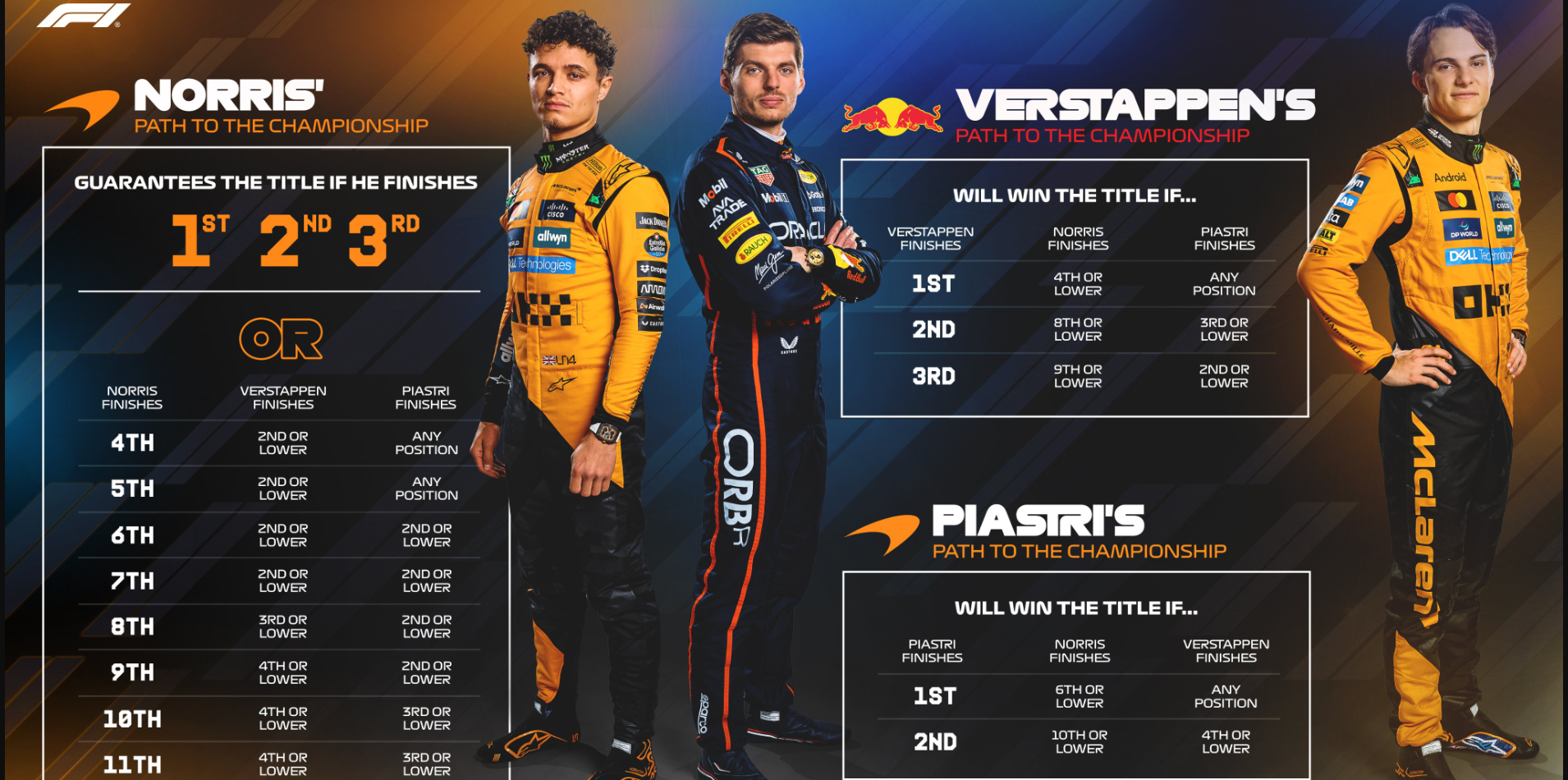 - Verstappen: Must win the race with Norris finishing no higher than 4th; or finish 2nd with Norris no higher than 8th; or claim 3rd with Norris no higher than 9th.