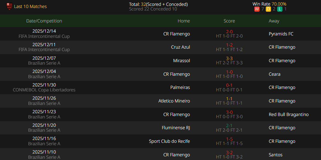 Building on this momentum, Flamengo advanced through the FIFA Intercontinental Cup qualifiers in Qatar. On December 10, they edged out Cruz Azul 2-1 in the Derby of the Americas, with Giorgian de Arrascaeta scoring both goals, including a dramatic late chip confirmed by goal-line technology, demonstrating his creative prowess and set-piece mastery. Three days later, on December 13, they secured a 2-0 win over Pyramids FC in the Challenger Cup final, with headers from Léo Pereira and Danilo—both assisted by De Arrascaeta—propelling them to the Intercontinental Cup final and earning the Challenger Cup trophy. These victories extended Flamengo's unbeaten streak to seven matches (W-W-D-W-W), underscoring their balanced attack, solid defense, and threat from dead balls.