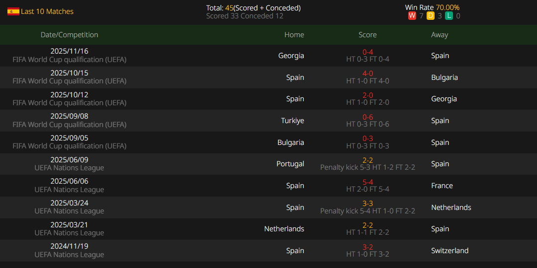Spain has essentially secured direct qualification in advance. Since they have the same points as Turkey in this round of qualifiers, the first tiebreaker is goal differenceтАФand SpainтАЩs goal difference is a full 14 more than TurkeyтАЩs. The Spanish menтАЩs team has not conceded a single goal in 5 matches, with a very solid defense. In their last match, they defeated Georgia away, achieving a 4-goal victory again, and the front line is still in fiery form. The team continues its tiki-taka tradition, with a possession rate exceeding 70%, breaking through opponentsтАЩ defenses through progressive short passes and flexible combination of wide and central play, and the defense is well-organized overall. However, the teamтАЩs defensive vulnerability to pacey counterattacks behind the backline is a hidden danger that coach Luis de la Fuente needs to be wary of.
