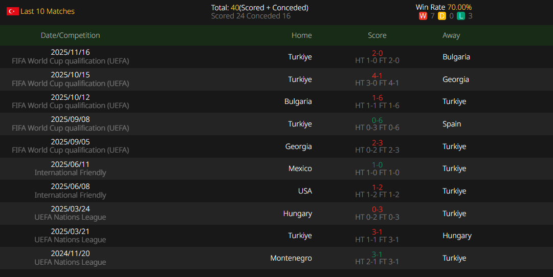Turkey has shown quite stable form recently, putting significant pressure on SpainтАЩs qualification with a 3-match winning streak. Currently, they have locked in second place in the group with a 4-1 record, advancing strongly. But since Spain has not slowed down, Turkey can only hope for the subsequent play-offs. Turkey has demonstrated tenacious defensive resilience and efficient counterattack capabilities, with a solid away record, making them the only team in the group that can pose a threat to Spain. However, the team faces multiple shortcomings such as the suspension of their defensive core, insufficient physical fitness, and weak positional play. Facing SpainтАЩs tiki-taka pressing, it will be difficult for their midfield to organize effective counterattacks, and the physical crisis after the 70th minute is a fatal hidden danger. Their overall strength and form are inferior to the opponent, making it extremely difficult to get points away from home.