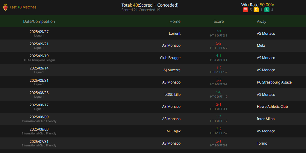 This season, Monaco has indeed lacked stability in terms of results so far. In their first Champions League match, they lost 1-4 away to Club Brugge. Admittedly, there were factors affecting their preparation for that game: their flight failed to take off on time due to an air conditioning issue, which meant the team only arrived at the away venue on the day of the match. Their overall preparation was fraught with disruptions, and they ultimately lost. Returning to the league, in their last match, they were defeated 1-3 away by Lorient. Although a red card was a contributing factor in that game, one key point to note is that the team is currently suffering significant losses in the midfield. Several absolute key midfielders—Aleksandr Golovin, Denis Zakaria, Youssouf Fofana Camara, and Mohamed Bamba—are all injured. As a result, defenders Axel Disasi and Ismaël Jakobs have been playing as makeshift midfielders, and this situation will remain the same in this match. The team still faces a shortage of personnel in the midfield, which is a current weakness for Monaco. Clearly, it will be difficult for them to take on Manchester City.