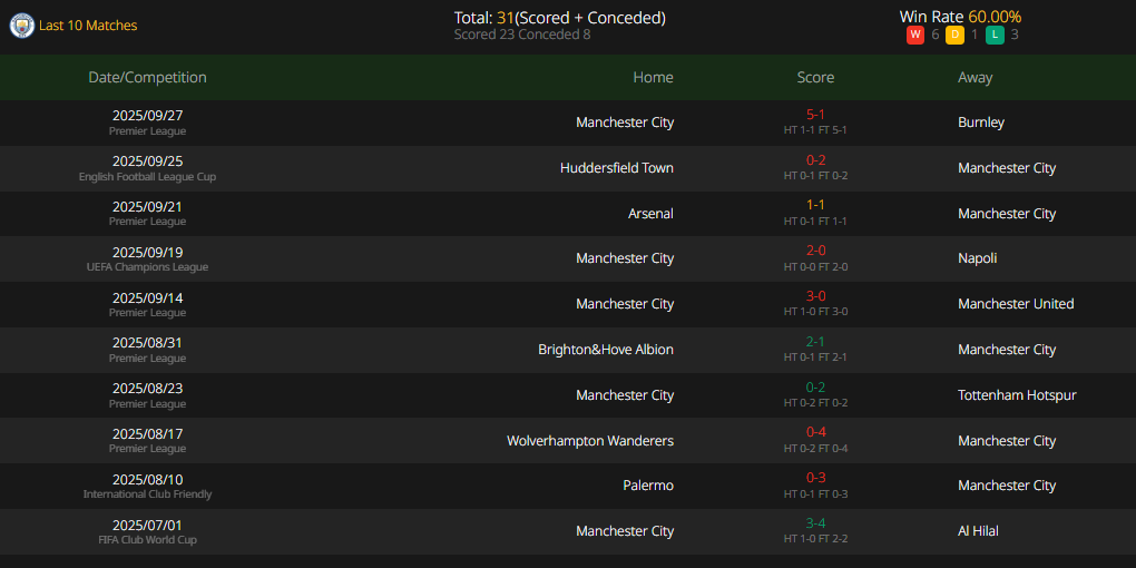 Manchester City easily defeated Napoli in their first Champions League match this season. Of course, the opponent’s red card played a role—Napoli captain Giovanni Di Lorenzo was sent off in the 21st minute, and Napoli basically gave up the game afterward, allowing City to win with ease. The team has also been in good form recently in the league: in their last league match, they beat Burnley 5-1, with Erling Haaland scoring 2 goals and providing 1 assist, still named the Man of the Match. From the perspective of the current squad, a few players including Cherki and Malmström are absent, but this has basically had little impact. At the same time, there is a positive factor: Rodri, the team’s key midfielder, did not play in the last league match but will return for this one. Up front, the attack is still led by Haaland, who has scored 50 goals in 49 Champions League appearances. He still aims to set a new record in this match.