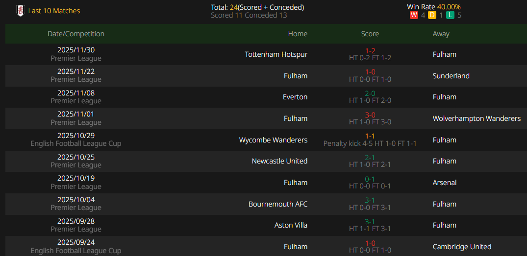 Fulham have recorded 5 wins, 2 draws, and 6 losses in 13 Premier League games, amassing 17 points to sit 15th. While their overall record is mediocre, they are on a two-game winning streak at home and recently upset Tottenham Hotspur 2-1 away, showcasing impressive resilience and clinical counter-attacking efficiency. Manager Marco Silva has long focused on leveraging transition moments for team success, so Fulham are expected to trouble City through counter-attacks or set-pieces. Two key Fulham players are doubts: left-back Antonee Robinson is questionable with a knee injury, while main striker Rodrigo Muniz is almost certain to miss out due to a hamstring issue.
