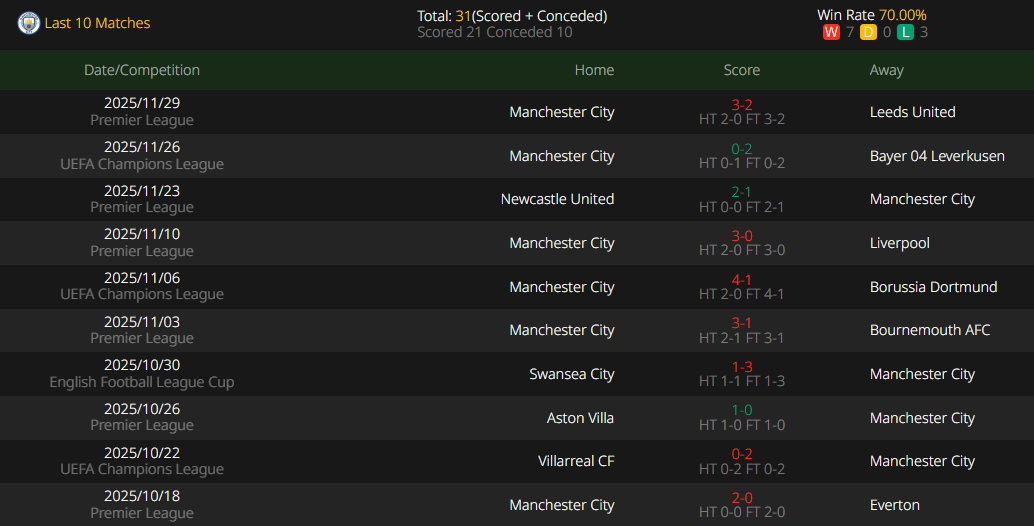 Manchester City currently rank 2nd in the Premier League with 8 wins, 1 draw, and 4 losses, accumulating 25 points—trailing leaders Arsenal closely. Despite recent inconsistencies, including defeats to Bayer Leverkusen in the Champions League and Newcastle United in the league, the Citizens have secured 5 wins in their last 7 competitive matches, maintaining formidable attacking firepower. In the just-concluded 13th round of the Premier League, City narrowly defeated Leeds United 3-2. Although defensive instability persists, Guardiola's side demonstrated the ability to maintain control in adversity. Key striker Erling Haaland has failed to score in three consecutive games; his return to form will be crucial for City's victory and his lead in the scoring charts. Regarding injuries, Mateo Kovačić remains sidelined with an ankle injury, while defensive linchpin Rodri is not fully fit and may miss out again.