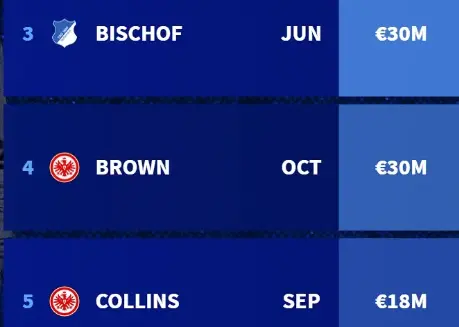 - Collins (Eintracht Frankfurt): Struggled in his September debut but remains a top prospect, with his value rising by €11M since January despite early struggles.