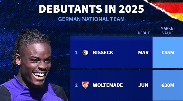According to Transfermarkt data, five players made their senior debuts for Germany in 2025. Inter Milan center-back Yann Aurel Bisseck tops the list with a €35M valuation, followed by Stuttgart striker Nick Woltemade and Hoffenheim midfielder Tom Bischof, both at €30M. Eintracht Frankfurt duo Nathaniel Brown (€30M) and Nnamdi Collins (€18M) round out the top five.